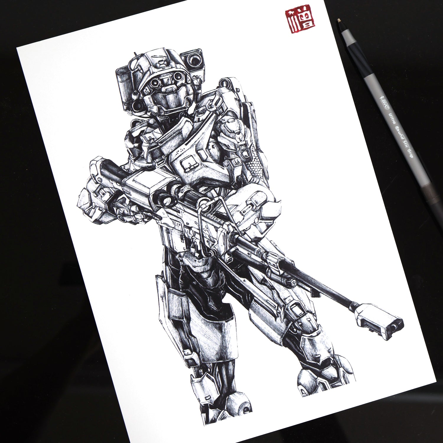 Rendered in bold black ink with intricate mechanical detailing, this fan art portrays Blue Team’s elite sniper, Petty Officer Linda‑058, in her MJOLNIR armor and equipped with an SRS99 rifle. The piece captures Halo’s tactical intensity while emphasizing the precision and discipline that define her role alongside Master Chief.